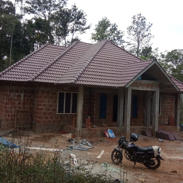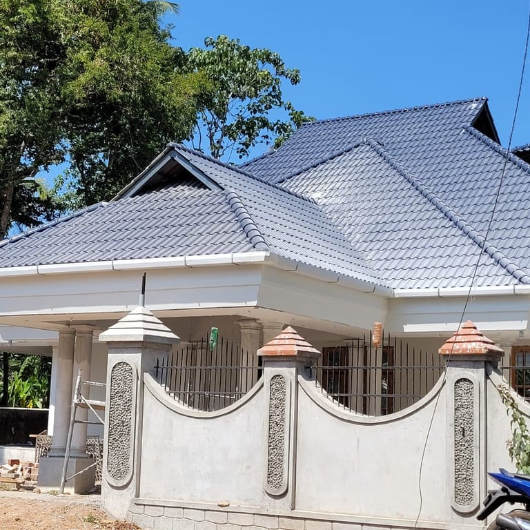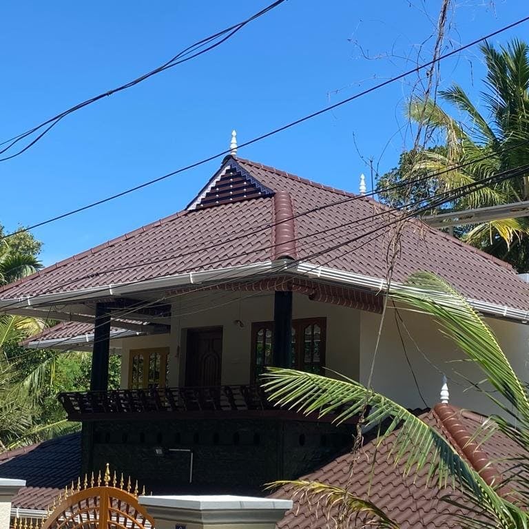 Stone coated sheet roofing is made of galvanized steel coated with stone chips, giving it a stylish finish and unmatched durability. It offers the perfect combination of metal roofing strength and tile roofing elegance, making it a preferred choice for premium homes, villas, and resorts across Kerala.